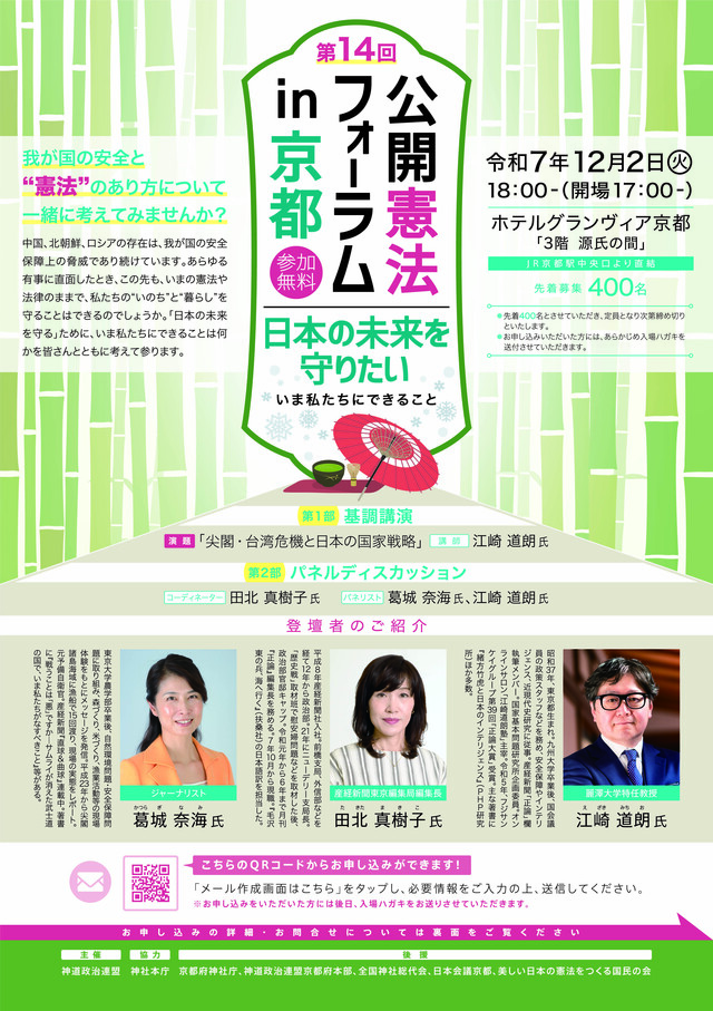 この度、京都市「ホテルグランヴィア京都」を会場に「公開憲法フォーラムin京都」を開催致します。
